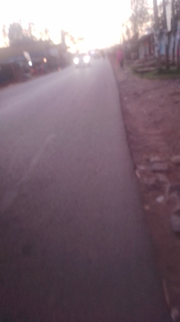 An out-of-focus image depicts a paved road stretching into the distance under a bright, hazy sky. The roadside features indistinct structures, possibly buildings or shops, and some vegetation. A pedestrian is walking on the roadside in the distance. Vehicle headlights are visible further down the road, suggesting moving traffic. The overall scene conveys a sense of movement and a somewhat blurry or unclear urban environment.