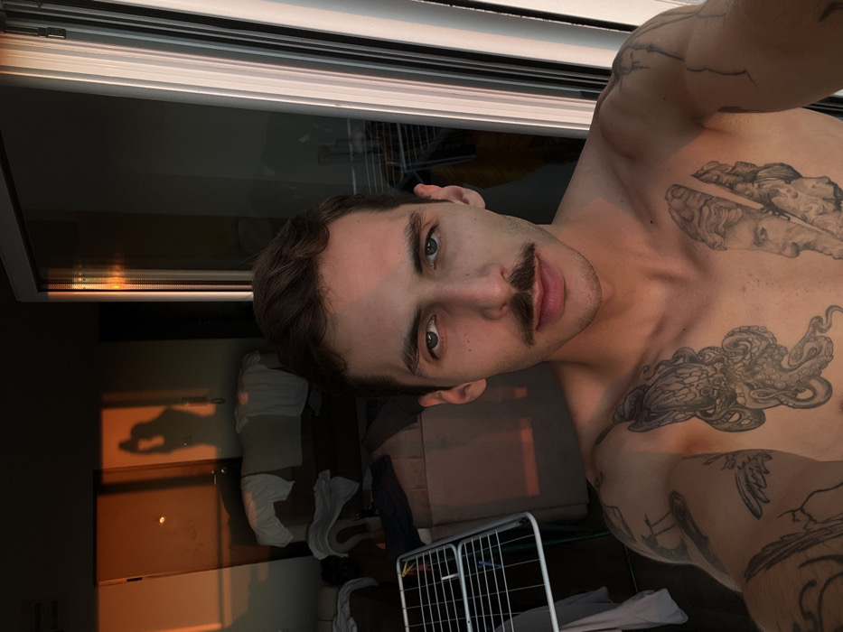 A young adult male, shirtless, is depicted in a close-up selfie taken indoors in Rafailovići, Montenegro. He has dark wavy hair, a prominent mustache, dark eyebrows, and green eyes, looking directly at the camera with a neutral expression. His physique is lean. Tattoos include an octopus design on his left pectoral and a fragmented classical bust on his right pectoral, with additional tattoos visible on both arms. The background shows a room illuminated by warm, low-angle sunlight, casting an orange hue on a wall to the left. A distinct shadow of a person holding a smartphone is projected onto this wall. Below the shadow, a white foldable clothes drying rack with draped white garments is visible, alongside other scattered clothing items on what appears to be furniture. To the right, a large sliding glass door or window frame reflects the ambient light, creating bright vertical lines and revealing a dimly lit interior through the glass.