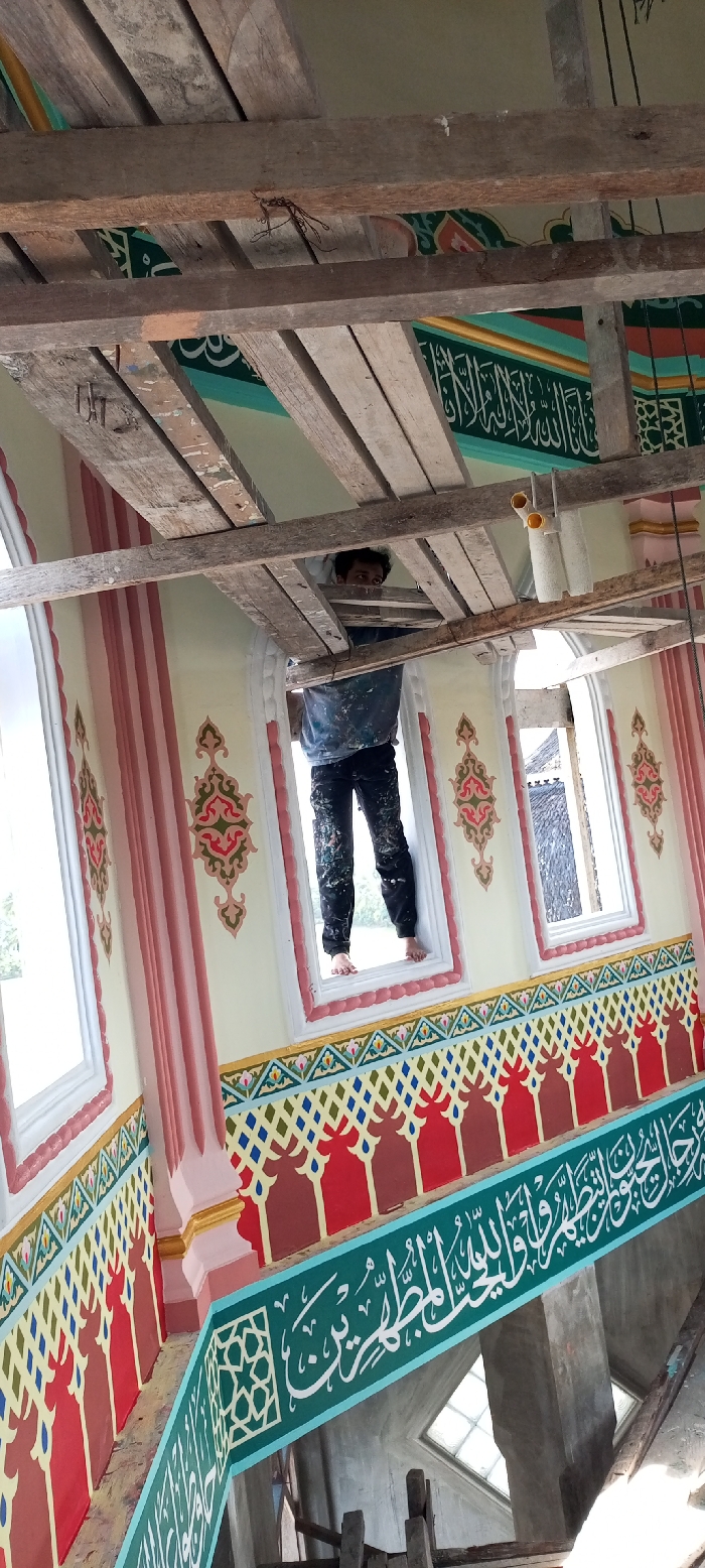 This image depicts the interior of a building under renovation in Kumbang, Indonesia. A barefoot male worker, wearing a paint-splattered blue long-sleeved shirt and black pants, stands on the sill of a rectangular window. His upper body is visible above a horizontal wooden scaffolding beam, with his head turned towards the viewer. The cream-colored walls are extensively decorated with multi-colored Islamic patterns and calligraphy. A prominent teal green horizontal band features white Arabic calligraphy. Below the windows, a patterned band displays red, maroon, and blue arch-like motifs interspersed with multi-colored diamond designs (gold, green, blue). Above the windows, intricate red, green, and gold floral patterns are painted. Multiple rectangular windows with white frames and pink sills admit natural light, revealing a muted green exterior and part of an adjacent roof structure. Pink fluted pilasters separate these windows. The upper portion of the scene is dominated by a dense network of rough-hewn wooden beams forming temporary scaffolding, some with exposed nails. A white PVC pipe with two yellow end caps is suspended from one of these beams. The ceiling, partially visible behind the scaffolding, shows light green and patterned sections.