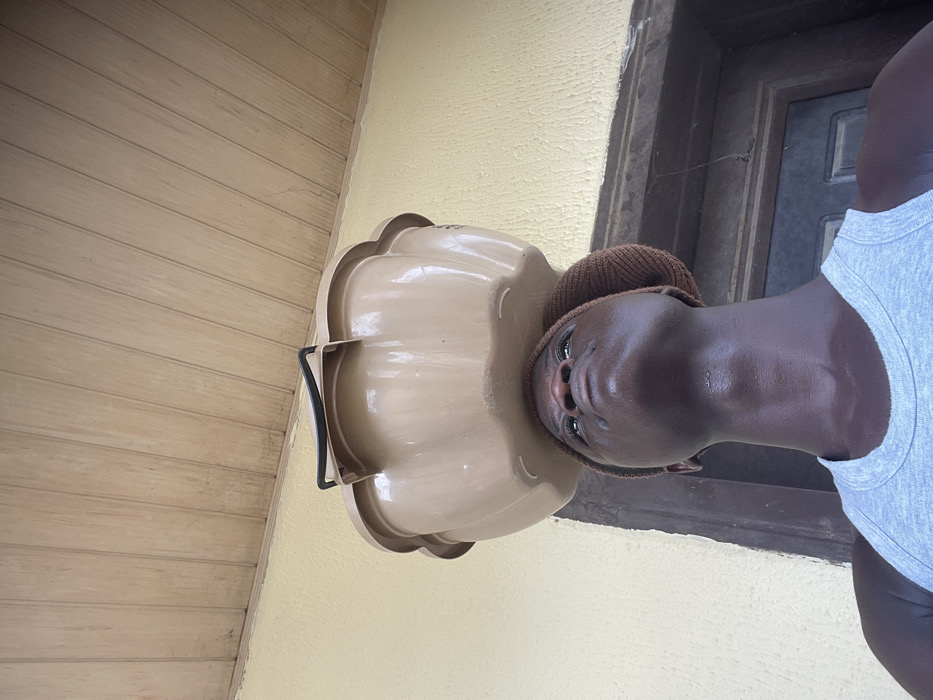 An upward-angled photograph captured in Ado, Nigeria, depicts an individual carrying a large, light-tan plastic container on their head. The person, an adult with dark skin, wears a brown knitted skullcap beneath the container and a light grey sleeveless undershirt. Their face is angled upwards, eyes slightly narrowed, with visible sheen on the forehead, nose, and neck, consistent with perspiration. The container features a scalloped edge and a recessed black handle on its lid. The background consists of a textured, light beige wall directly behind the person, topped by a light brown wooden plank ceiling or soffit exhibiting some discoloration. A dark brown doorframe or window frame is partially visible to the right.