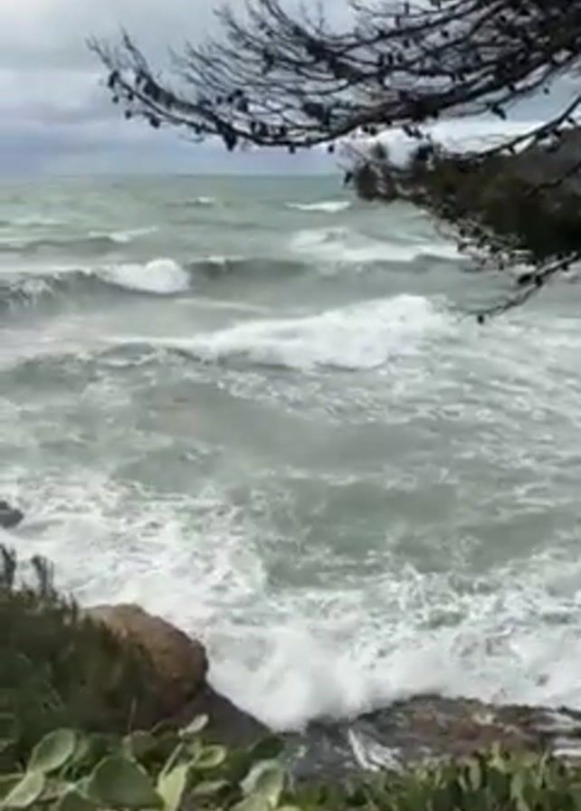 rough, gray-green sea with white waves breaking against a rocky shoreline