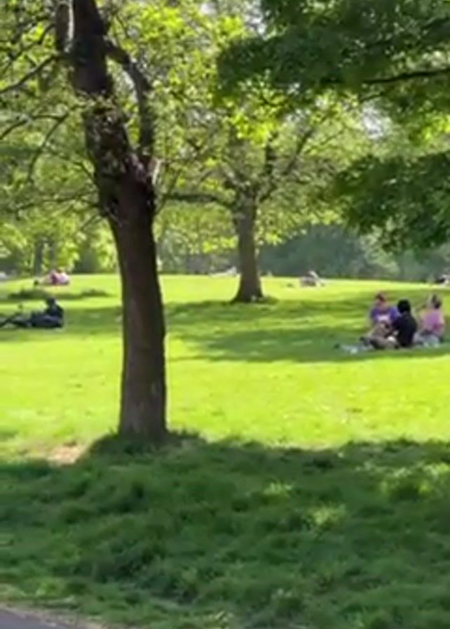 The video showcases a vibrant park scene on a sunny day. The environment features lush green grass, interspersed with mature trees providing shade. People are scattered throughout the scene, some sunbathing or relaxing on the grass, others sitting on benches along the walking paths. The atmosphere is calm and leisurely, suggesting a pleasant day outdoors.