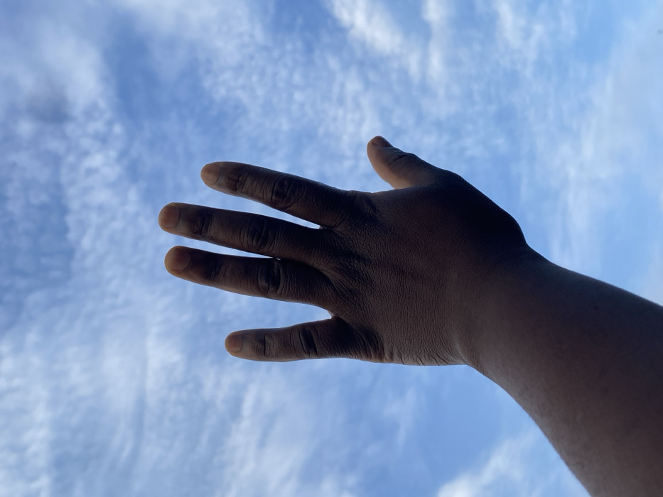 A dark-skinned hand is silhouetted against a blue sky filled with wispy, scattered clouds