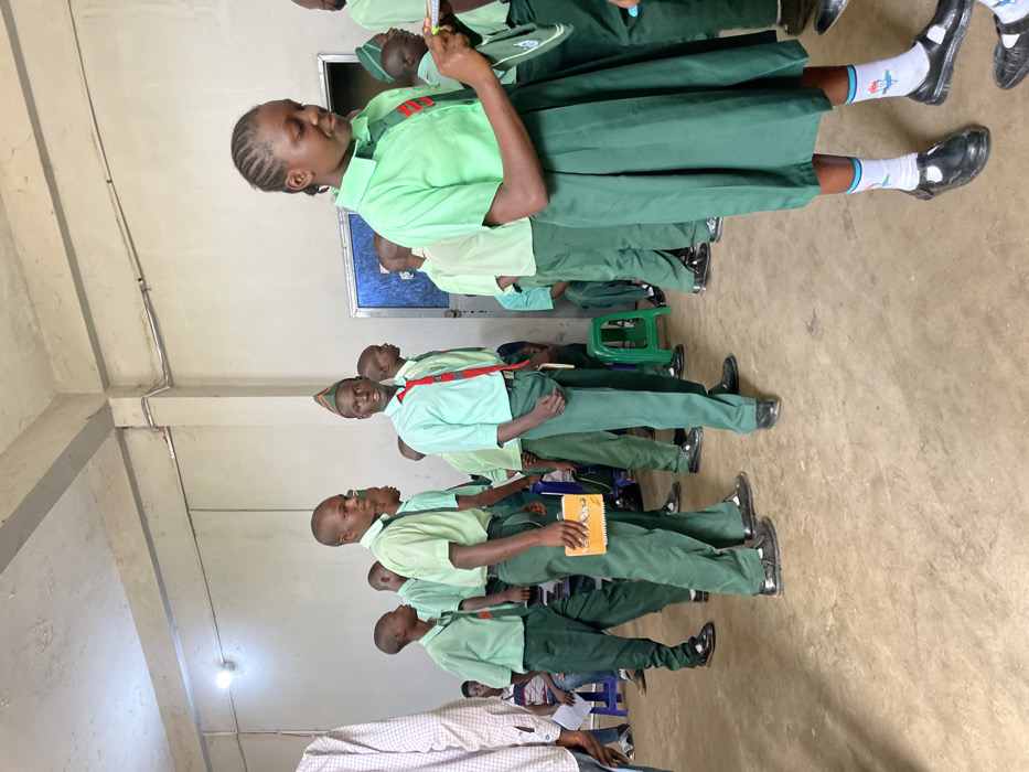 This image depicts an indoor gathering in Jos, Nigeria, featuring approximately 15 to 20 young individuals, predominantly Black, in what appears to be school or youth organization uniforms