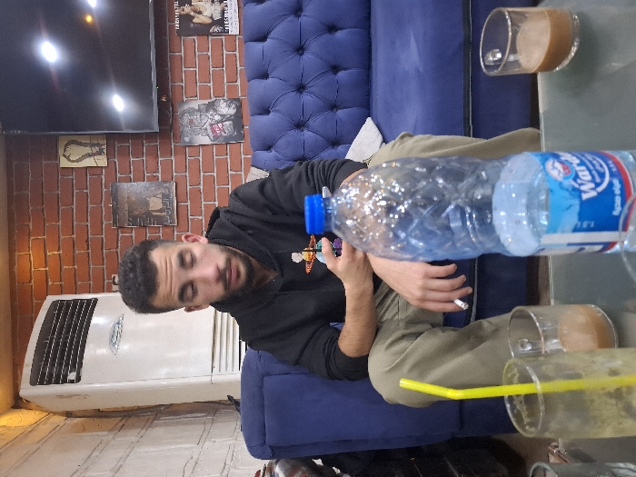 A person sits on a blue tufted couch, wearing a black hooded sweatshirt and khaki pants. They hold a lit cigarette. On the table, there is a water bottle and two glass beverages, one with a yellow straw. The background features a brick wall with framed images and a television. A white air conditioning unit sits to the left.