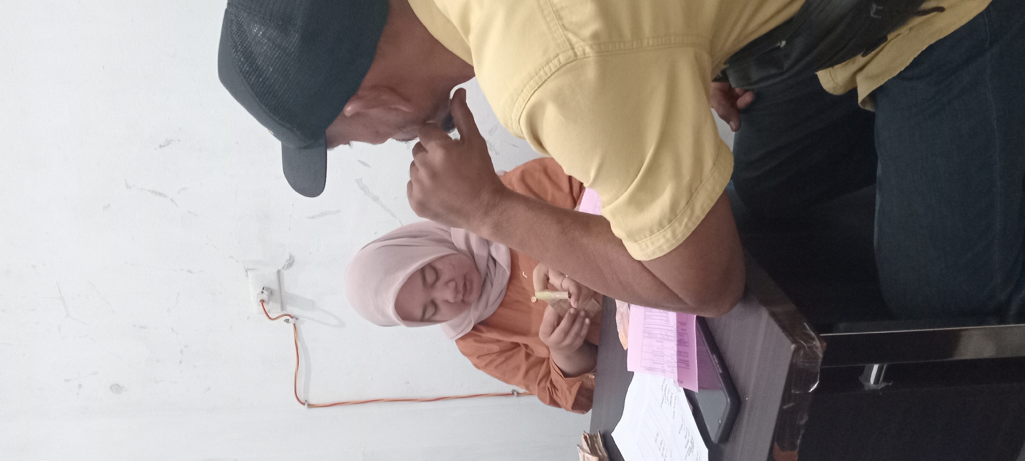 The image depicts an indoor scene in what appears to be an office or administrative setting in Lhokseumawe, Indonesia. Two individuals are seated at a dark brown table. On the left, a woman wearing a light pink hijab and an orange long-sleeved shirt is seated, focusing her attention downwards on her hands. She is actively handling and counting a stack of Indonesian Rupiah banknotes. Several additional stacks of banknotes are visible on the table to her left. Opposite her, on the right, a man is partially visible from his right side and back. He wears a black baseball cap, a light yellow collared shirt over a dark blue undershirt, and dark blue trousers. His right arm rests on the table, and his right hand is positioned near his chin, suggesting observation or contemplation. His gaze is directed towards the woman or the table surface. On the table between the two individuals, various items are present: a white sheet of paper with written information (possibly a form or ledger), several pink documents or forms stacked together, and a black smartphone lying flat. The table has a visible metallic leg and some clear plastic wrapping along its edge. The background consists of a plain white wall with minor imperfections. An electrical outlet is affixed to the wall on the left, with an orange power cord plugged in and running vertically downwards, secured by white clips. The scene suggests a financial transaction or administrative process involving money and documents. The exact location within Lhokseumawe cannot be determined from the visual evidence provided.