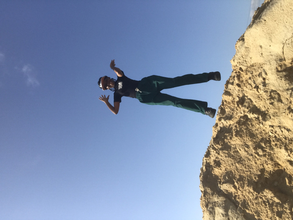 In Badore, Nigeria, a lone individual is captured mid-air, suspended against a clear, bright blue sky. The subject, appearing female, wears a dark short-sleeved top, dark green trousers, and dark footwear, complemented by a light-colored visor with an orange brim. Both arms are raised and bent at the elbows, hands open with fingers splayed. A smile is evident on the person's face. The subject is positioned above a large, light brown sand pile that forms the lower third of the scene. The sky is predominantly cloudless, indicating sunny weather conditions.
