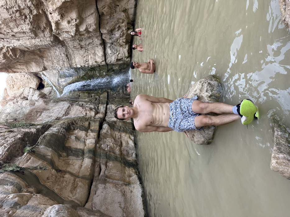 A young adult male, shirtless and wearing blue and white patterned swim shorts, is centrally seated on a submerged, rounded grey rock in a shallow, light brown pool of water. His legs extend into the water, with his lower calves and feet submerged. He wears light grey ankle socks and neon green and black athletic shoes. He looks directly at the camera with a neutral expression. In the background, a waterfall cascades down a sheer, multi-layered rock face into the pool. Several other individuals are present in the water further back: a male to the immediate right of the primary subject is waist-deep, another male is chest-deep, and a female in a red bikini top is chest-deep. A small group of additional individuals are partially visible at the base of the waterfall. The scene is set within a narrow canyon or gorge, flanked by towering, light-colored sedimentary rock formations displaying visible striations and dark vertical streaks. Sparse green vegetation grows from crevices on the rock walls. The water in the pool appears turbid. The location is identified as Ein Gedi Nature Reserve, within the Tamar Regional Council, Israel.