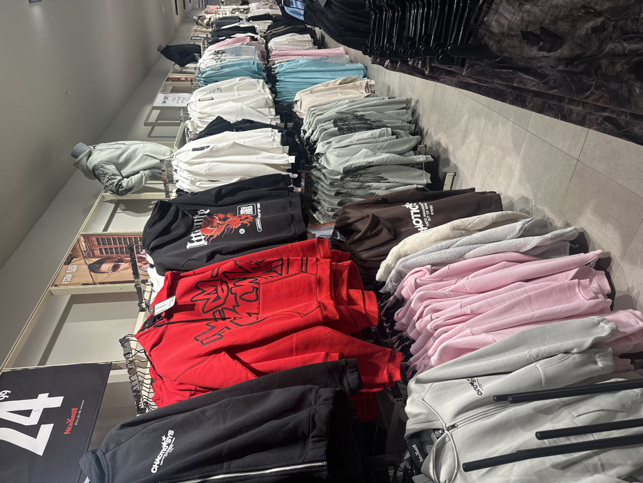 The scene is an interior view of a New Yorker clothing store located in Heilbronn, Germany. Multiple rows of hoodies and sweatshirts are displayed on metal garment racks throughout the foreground and midground. The garments exhibit a variety of colors including black, red, white, light blue, pink, grey, and brown. Specific items observed include: * A black zip-up hoodie with white "CHAOSYS" text on the left chest. * A vibrant red pull-over hoodie with a large, black, abstract graphic design on the front. * A black pull-over hoodie featuring a red dragon graphic and white "Intuition" text with Japanese characters below it. * A light grey pull-over hoodie with dark, wing-like designs on the shoulders, worn by a torso mannequin positioned above a rack in the midground. Overhead, a black sign displaying "NEW YORKER" and "24.99" is visible in the upper left. Other wall-mounted signs include one with "FSEN BLAIR" and another with "IM 50%". The floor is composed of light grey square tiles, and the walls are painted white. The area is uniformly illuminated by overhead artificial lighting fixtures. No people are present within the captured frame.