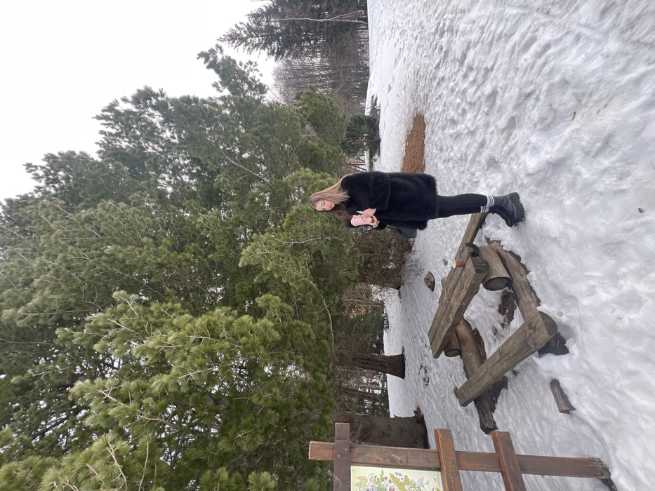 A young adult female stands in a snow-covered, forested area identified as Vitosha Mountain, within the Sofia Municipality, Bulgaria. The subject, positioned slightly right of the frame's center, wears a black faux fur coat, black leggings with white ankle stripes, and black platform combat boots. She holds a light pink thermos or insulated bottle in both hands, looking down at it. A black bag strap is visible across her chest. To her left, a rustic wooden signpost stands upright, featuring a framed informational panel with botanical illustrations. Further left, a crudely constructed wooden picnic table or bench, made of logs and planks, is partially obscured by snow. A small brown cup rests on one of its planks. The ground is covered in white snow, with some patches of brown earth visible. The background consists of numerous tall coniferous trees with green needles, indicating a pine or fir forest. Beyond these, sparser, bare deciduous trees are visible on a gentle slope. The sky is overcast, suggesting a winter setting.