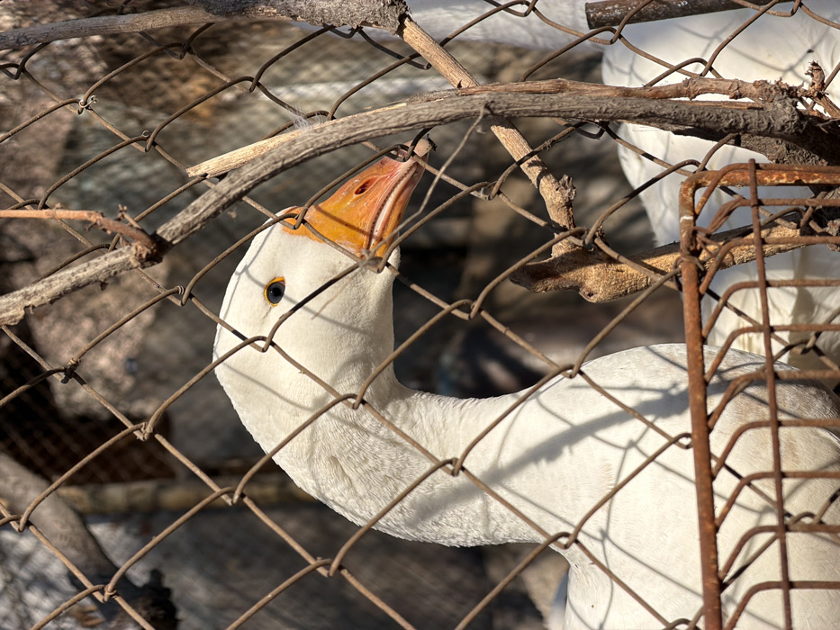 - "An adult white goose is observed from the mid-neck upwards, positioned behind a weathered wire mesh fence with square apertures" by FM-E6NNb2, licensed under CC BY 4.0