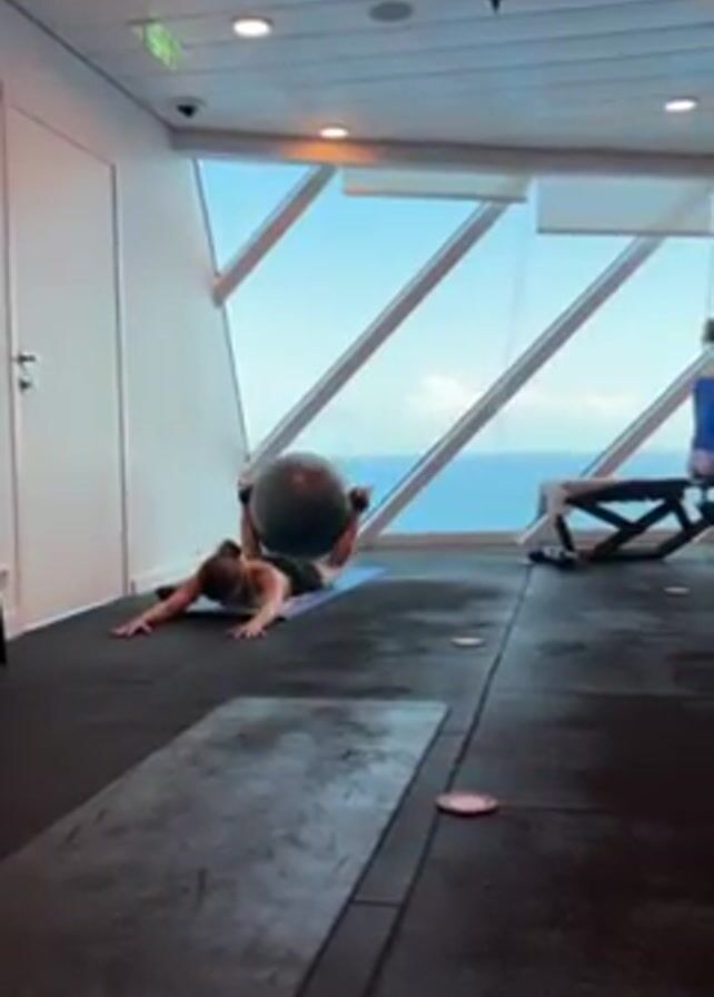 woman doing an exercise on a mat with a large exercise ball. She is lying on her stomach on the mat, with the ball held between her feet and ankles, and her arms are extended out to the sides. The floor is black rubber. There are large, geometrically-shaped windows behind her, with a view of the ocean and blue sky. Another person and exercise equipment are visible further in the background. The video appears to be taken in a gym or exercise room on a cruise ship.