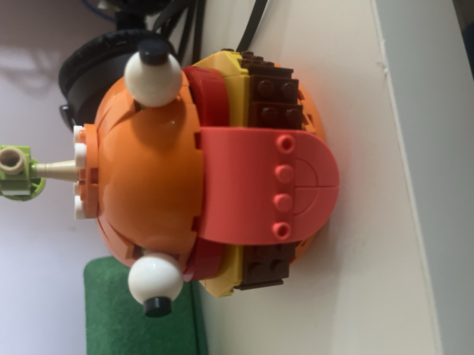 This image, taken in Gosnells, Australia, displays a LEGO model of a cartoon-styled hamburger with anthropomorphic features, positioned on a white surface