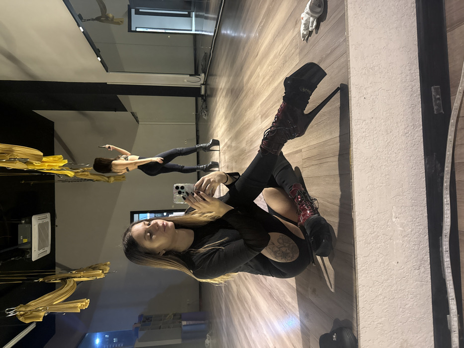 This image depicts the interior of a studio located in Batumi, Georgia, characterized by light-colored wooden flooring and a large mirrored wall on the right. In the foreground, a female with long brown hair is seated on the floor, facing forward, holding a silver-colored smartphone with a clear case in both hands, appearing to take a selfie or record. She wears a black long-sleeved top and black leggings with a cutout on the left thigh revealing a floral tattoo. Her left foot is shod in a dark red, lace-up boot, while her right foot is clad in a black extreme high-heeled platform boot. A second black shoe, possibly a flat, is positioned near her left foot. Her fingernails are painted black. In the background, visible as a reflection in the mirrored wall, another female stands facing away from the camera, holding a dark smartphone to her face. She wears a light-colored crop top, black leggings, and black extreme high-heeled platform boots. The studio features a black ceiling from which multiple yellow fabric slings (aerial silks) are suspended. An air conditioning unit is visible on the ceiling. A crumpled white item lies on the wooden floor to the right of the foreground subject. A white LED strip light is positioned along the bottom edge of the frame.