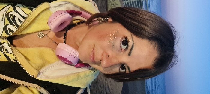 A portrait-oriented image taken at dusk in Nahariyya, Israel, depicts an adult female subject from the chest up, positioned outdoors against a coastal backdrop. **Subject:** The subject is a woman with dark brown, shoulder-length hair, parted slightly off-center. She has dark eyes, arched eyebrows, and glitter makeup applied to her left cheekbone area. Her face features a small stud piercing in her right nostril and a septum ring. Her left ear displays multiple earrings, including a prominent chain-like dangle earring. She exhibits a subtle, neutral expression. **Attire and Accessories:** She wears a yellow hooded zipper jacket, partially unzipped, over an unseen dark garment. A pair of pink over-ear headphones rests around her neck. She accessorizes with a black beaded necklace and a silver-colored pendant necklace featuring a "Tree of Life" design. Partial black and white graphics are visible on the front of her yellow jacket. **Environment:** The background consists of the Mediterranean Sea under a twilight or dusk sky, characterized by a gradient of light to deep blue. To the left of the subject, a section of a concrete or metal structure, possibly a pier or seawall, is visible, along with faint graffiti on a surface. The lighting is soft and ambient, indicative of the evening transition. The scene is consistent with a coastal promenade or seafront location within the city of Nahariyya.