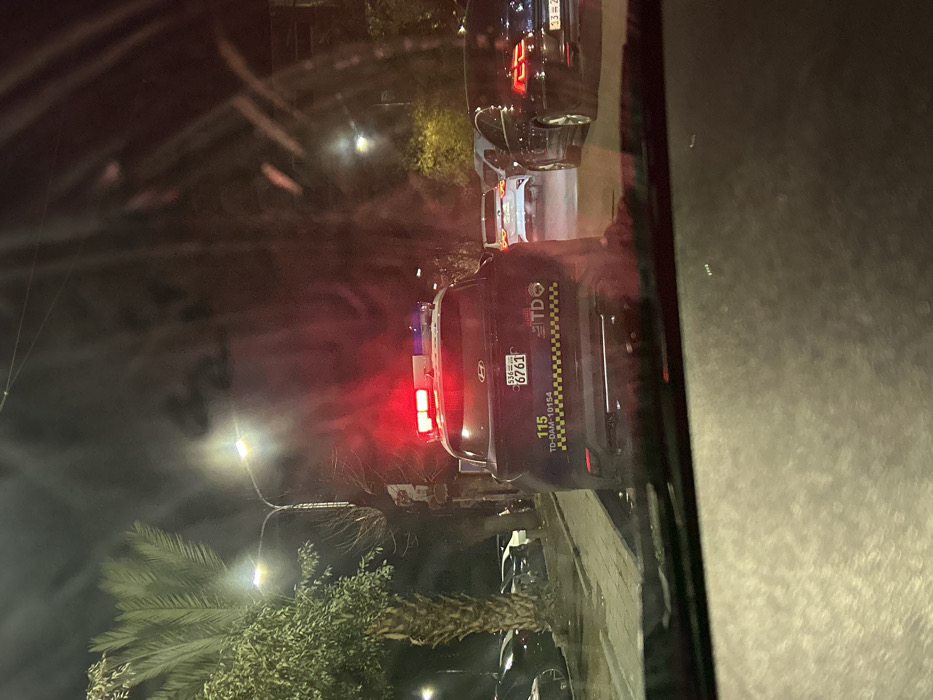 A nighttime view, possibly from inside a car, shows a street scene with several vehicles. A black taxi van with the letters "TDO" is prominently visible, with its rear lights illuminated. The license plate reads "536...6761." Further down the street, other cars are parked or moving, their lights adding to the nighttime ambiance. A palm tree and streetlights are also visible, contributing to the overall urban landscape.