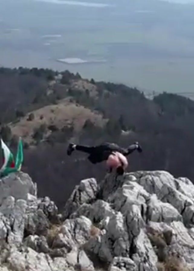 A male, shirtless and wearing black trousers and shoes, balances in a handstand split on a rocky mountain peak. His head is down and legs are spread wide. The mountain range stretches into the distance, with a flag on another peak nearby. The sky is hazy.