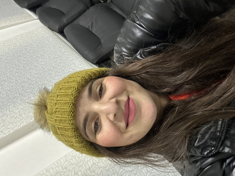 A young woman with long brown hair smiles for a selfie. She wears a mustard-yellow knit hat with a fur pom-pom and a black puffer jacket. Red clothing peeks out from beneath the jacket. Her skin is fair with rosy cheeks and pink lipstick. The background features a light-colored surface with a subtle leaf pattern on the left and dark leather seats on the top. The image is rotated, placing the woman's head near the right edge of the frame.