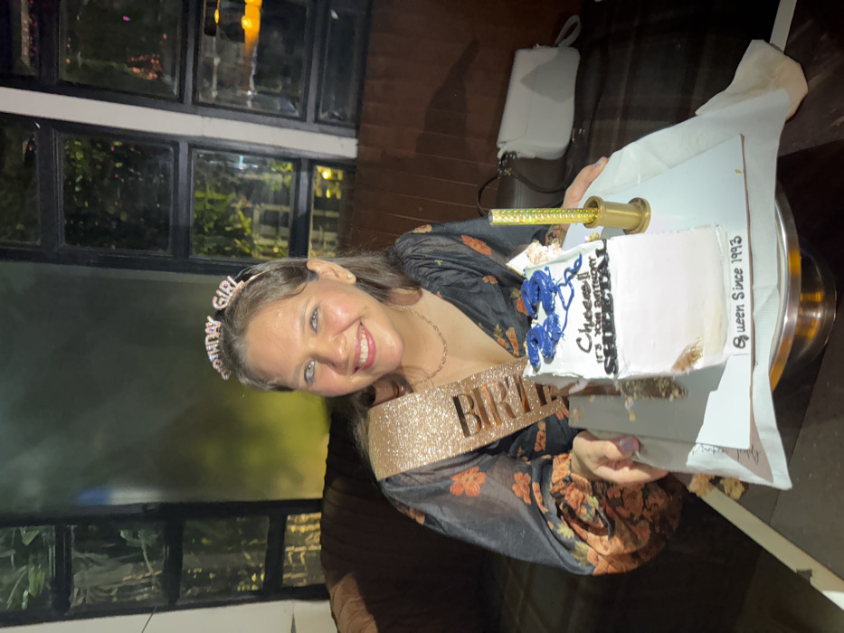 A woman, wearing a "birthday girl" crown and sash, smiles holding a decorated cake