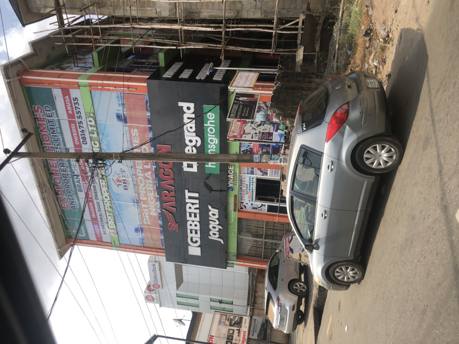 The image displays a daytime street view on Wetheral Road in Owerri, Nigeria. The central focus is a multi-story commercial building with a contemporary design. Its facade is covered by several large advertising banners. The uppermost banners identify "EXPLORER HOMES AND PROPERTIES LIMITED" and "BRIT PROPERTY NIGERIA LTD," explicitly stating "60 WETHERAL ROAD, OWERRI" as a location. A prominent black signboard below features white logos for "ARAGON," "GEBERIT," "Legrand," "Jaquar," and "hansgrohe." The ground floor has a storefront with a green-framed entrance, revealing internal signage including "HEALTH CARE STORE &..." and "VINACE HOMES." The building exhibits orange and green accents on its exterior. To the left of the main building, a white commercial structure with "Globus Bank" signage is visible. To the right, a concrete building under construction is present, characterized by extensive bamboo scaffolding along its side. In the immediate foreground, a silver Nissan Versa hatchback is situated on the asphalt road, facing away from the viewer. The vehicle's rear bumper shows minor scuff marks, and a small sticker is affixed to the rear window. Further down the road on the left, a dusty, light-colored SUV, identified as a Lexus RX, is parked. The asphalt road surface exhibits localized damage and debris along its edges. A utility pole, likely wooden, stands in the center-right foreground, partially obstructing the view of the main building. Numerous tangled overhead wires extend from this pole and crisscross the sky, which appears partly cloudy. No individuals are clearly identifiable performing specific actions in the external scene.