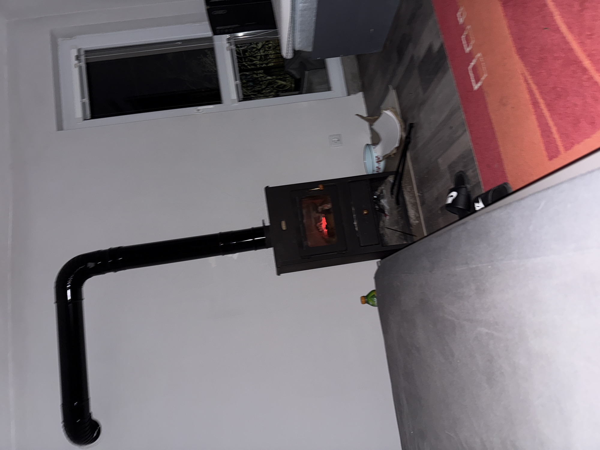 A wood-burning stove with a black flue pipe is visible in a room. The stove is burning. A window is above the stove, partially obscured by furniture. A rug with red and orange stripes is on the floor. Slippers are on the floor next to the rug. The location is Gorna Dikanya, Bulgaria.