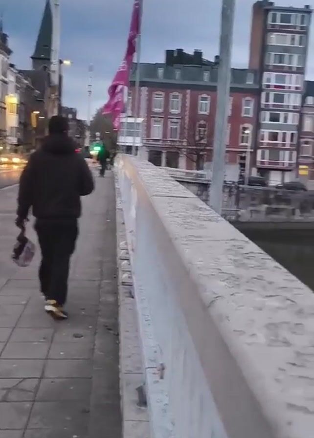 A person wearing a black hooded sweatshirt, black pants, and yellow sneakers is walking along the sidewalk of a bridge in an urban area. The person is carrying a rectangular object in their right hand. The bridge has a concrete railing on the right side. To the left, there is a street with cars and buildings. In the distance, there is a church steeple. The camera pans to the right, revealing a body of water with buildings on the opposite bank. The sky is overcast. There is a flag on the right side of the frame. There are other bridges visible over the body of water.