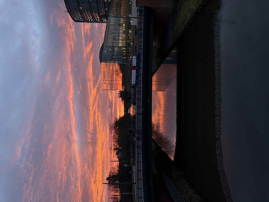 A canal reflects a dramatic orange and pink sunset. Modern architecture sits along the canal's edge, its facade also mirroring the vivid sky. A walkway with a railing runs alongside the water. The water's surface reflects the sky and building lights creating a mirroring effect. Part of the water is dark and calm.