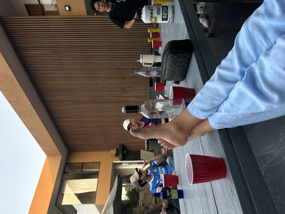 An outdoor gathering shows people around a table. A bottle of liquor and red cups are scattered along the table, suggesting a party or casual get-together. Several individuals are visible, some in casual clothing, and the scene suggests a relaxed atmosphere. A building is partially visible in the background.