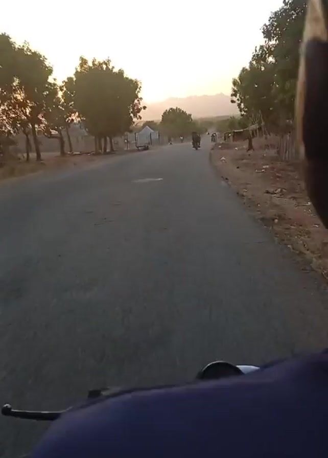 The video, shot from the perspective of someone riding a motorcycle, shows a slightly bumpy asphalt road leading through a rural area at what appears to be dusk. A few buildings and scattered trees line either side of the road. In the distance, mountains are visible under a bright sky. Several other motorcycles and a few people are seen further down the road. The rider is wearing a blue shirt.