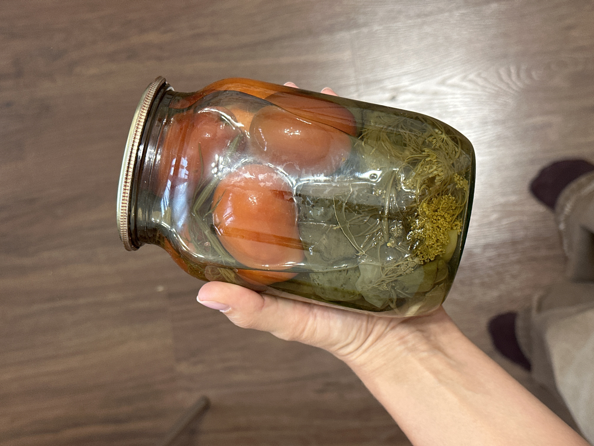 An image captured in Surgut, Russia, depicts a single human hand holding a large, clear glass jar. The hand, exhibiting pale skin and manicured fingernails with light polish, grasps the right side of the cylindrical jar. The jar is filled with whole, red pickled tomatoes, green leaves, and sprigs of dill, all submerged in a clear preserving liquid. A metallic, ridged, brass-toned screw-on lid seals the jar. The background consists of a light brown wood-patterned floor. A partial view of light-colored clothing and a dark-colored slipper or shoe are visible in the lower portion of the frame.