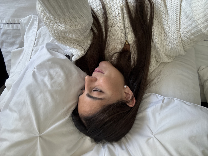 A woman rests her head on a white pillow, her eyes closed. She's wearing a white knit sweater with a visible zipper. Her long brown hair cascades around her face and onto the bedding. A small pearl earring adorns her ear. The white bedding is slightly rumpled, indicating relaxation. The angle suggests a selfie perspective, looking down at the subject.
