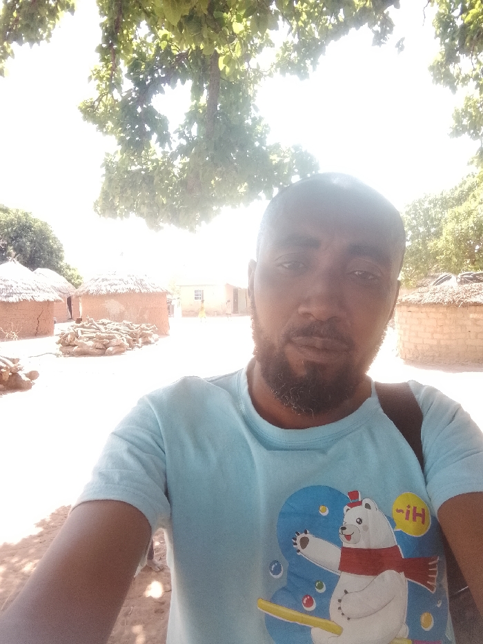 An adult male with dark skin, a short haircut, and a dark beard is prominently featured in a close-up, selfie-style image
