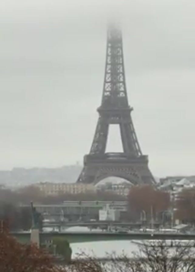 view of the Eiffel Tower in Paris, France on a gray, overcast day. The top of the tower is shrouded in fog or clouds. In the foreground is a bridge over a river, and some trees with bare branches. The city of Paris is visible in the background, albeit obscured by the weather. The video is static, with no camera movement.