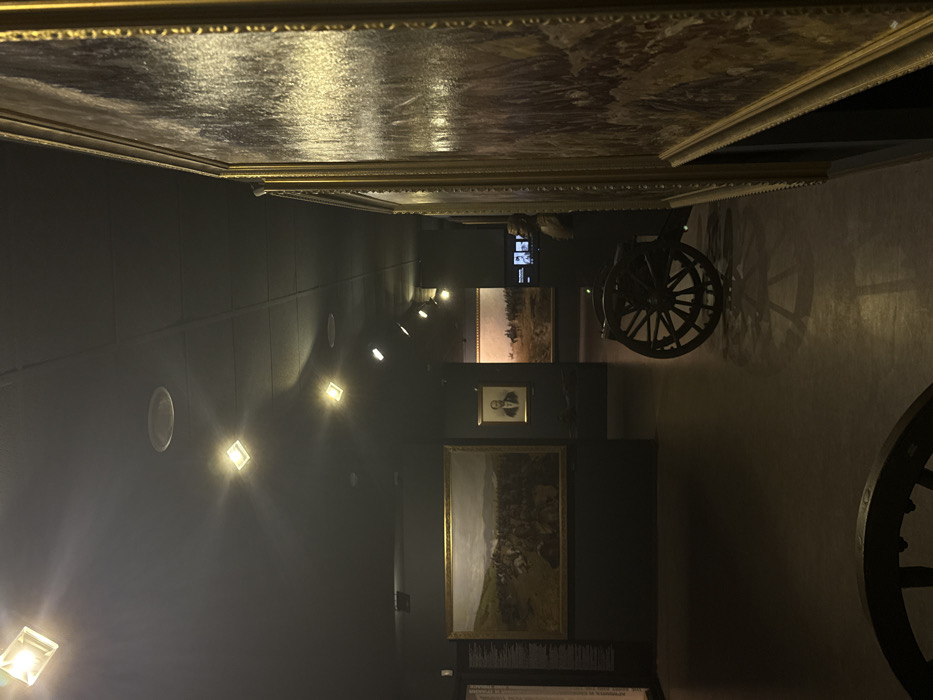 The image displays the interior of a dimly lit museum gallery, identified as the National Museum of Military History in Sofia, Bulgaria. The space features dark matte walls and a dark floor. A dark ceiling is equipped with multiple square, recessed spotlights providing directional illumination to the exhibits, casting distinct shadows. On the left side of the gallery, a large, gold-framed historical painting depicting a battle scene with numerous figures in a green landscape is prominently displayed on a dark wall. To its right and further into the gallery, a smaller, gold-framed portrait of a man in formal attire is mounted. Partially visible text panels run along the far left wall. In the middle ground, a dark, historical cannon with prominent wooden spoked wheels rests on the floor, positioned with its barrel pointed towards the left. A distinct shadow of the cannon is cast on the floor. Near the cannon, a bronze bust of a man is visible atop a dark pedestal. The immediate right foreground is dominated by the gold frame and a portion of the dark, textured canvas of another very large historical painting. In the background, along the far wall, additional large historical paintings depicting military or battle scenes are visible. To the right of these background paintings, a digital display screen exhibits multiple individual portraits. No individuals are visible within the scene.