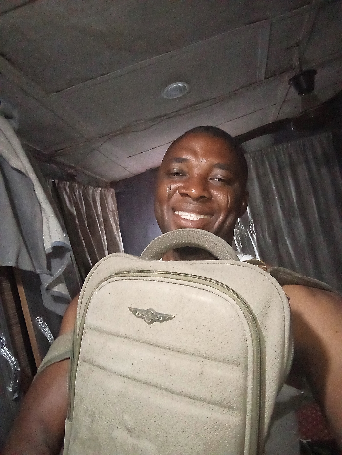 A smiling man wears a light-colored backpack. He has short, dark hair and a visible scar on his cheek. The backpack features horizontal stripes and a winged emblem. The background shows curtains, and a textured ceiling with a light fixture and a small hanging item. The scene appears to be indoors, possibly in a small, enclosed space. The lighting is dim, casting shadows on the surroundings.