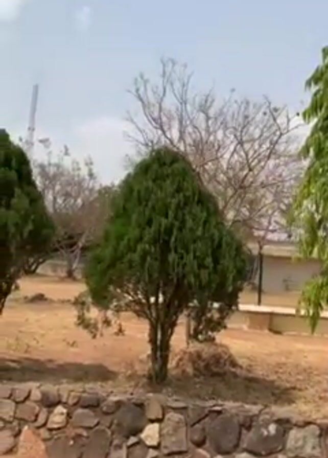 park with several different types of trees and a dry ground. The trees are planted in a row, separated from the road by a low stone wall. A child briefly appears in the frame. The sky is overcast. Streetlights are visible along the road.