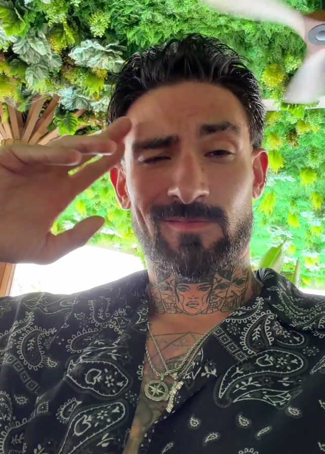 A low-angle shot features a man with a beard, tattoos, and a black paisley shirt, sitting outdoors. He winks and gives a peace sign. The background includes lush green foliage, suggesting a garden or restaurant setting. A light-colored ceiling fan is visible in the upper right corner. The man is wearing two necklaces and looks directly at the camera with a slight smile.