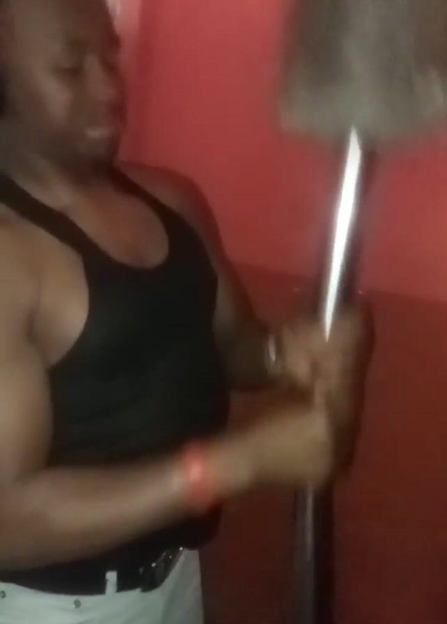 A person is lying down on a surface, presumably a bench or the floor, and performing a bench press with a barbell. The person is wearing a black tank top, white pants with a black belt, and an orange wristband. The background is a red wall. Sounds of a child are audible in the background.