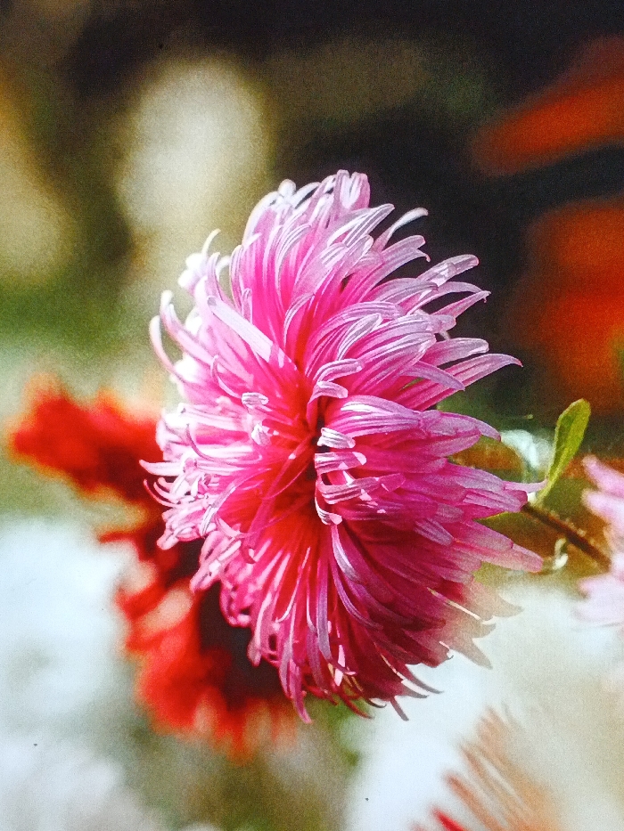 A vibrant pink aster flower is prominently displayed in sharp focus, with its slender, spiky petals radiating outwards. The background is blurred, featuring indistinct shapes and colors that include white, red, green, and brown. A small green leaf can be seen near the flower, suggesting it is still attached to the plant. The overall composition highlights the flower's striking color and unique texture against a soft, out-of-focus backdrop.