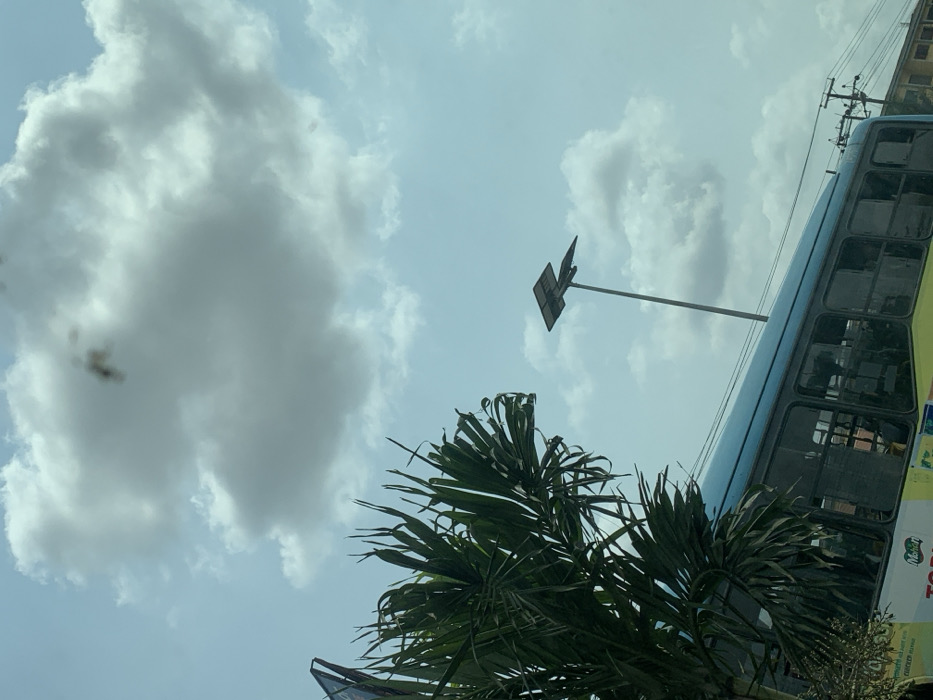 The image depicts a street scene in Ikeja, Nigeria, under a partly cloudy sky. A dense, green palm-like tree occupies the left side, extending into the upper left quadrant. To the right of the tree, a tall, slender pole with a square solar panel mounted at its apex and a downward-angled light fixture stands against the sky. The upper section of a light blue and yellow passenger bus is visible in the lower half of the frame, positioned diagonally from the lower left to the mid-right. The bus features multiple rectangular windows and advertising text, including a partial "TOPE" and a green logo resembling "Maltina." In the far background on the right, utility poles with wires and faint building outlines are discernible. No specific individuals or explicit actions are clearly visible. A dark, irregular smudge is present in the sky near the top center.