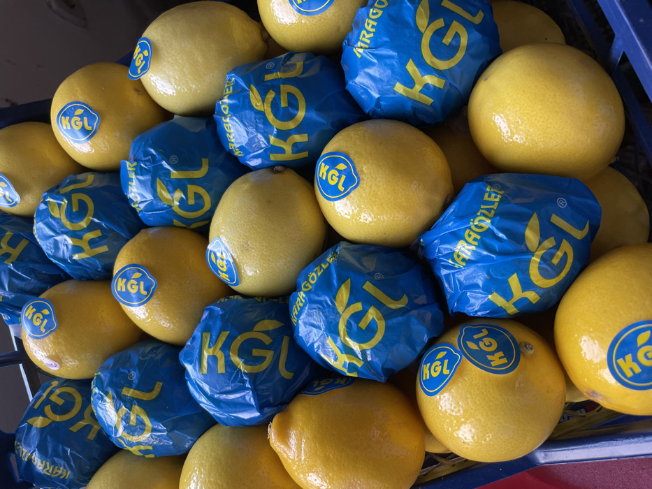 This scene in Mojanovići, Montenegro, displays a dense aggregation of numerous ripe, yellow lemons. Many of the lemons are individually encased in a vibrant blue plastic mesh or wrap, prominently featuring the yellow capital letters "KGL" and smaller text "KARAGÖZLER". Other lemons are unwrapped but bear round, blue stickers with the identical yellow "KGL" logo. The lemons exhibit varied skin textures and are tightly packed together, presumably within a commercial container or crate, parts of which are visible as blue plastic lattice along the frame's perimeter. No individuals are present within the depicted area.