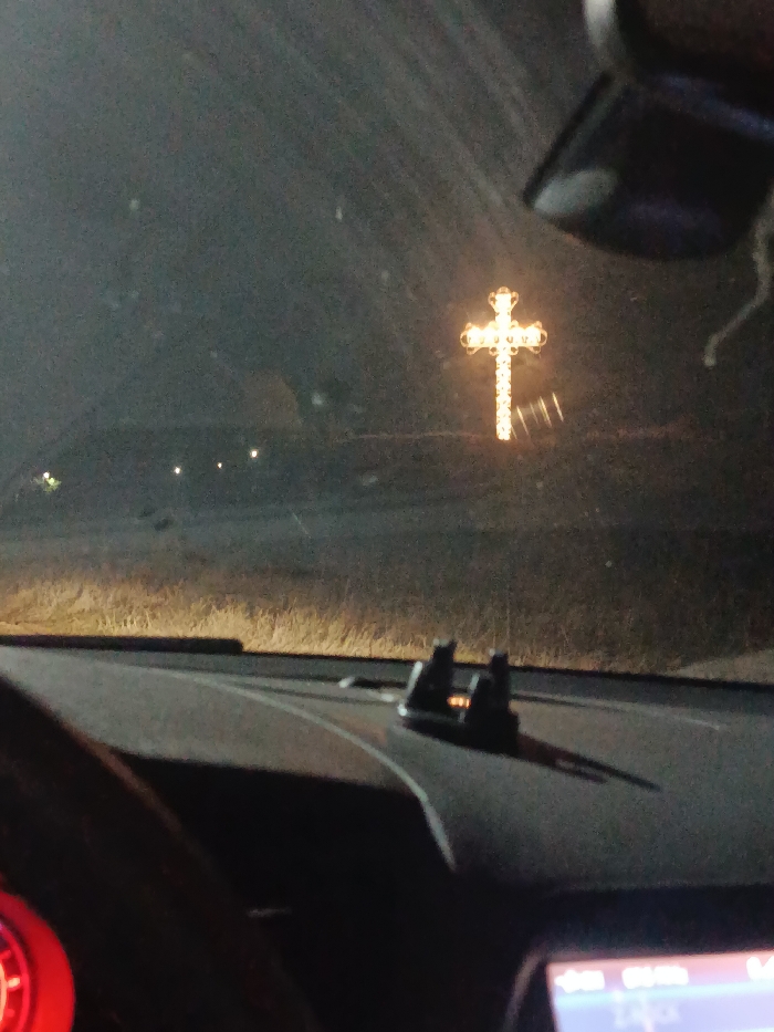 The image depicts a nighttime scene from the perspective of a vehicle's interior, looking forward through the windshield in the city of Novi han, Bulgaria. A large, illuminated Christian cross, constructed from numerous yellow or orange light bulbs, stands prominently in the middle-right distance against a dark background. Below the cross, a dark road surface is visible, bordered on the left by a strip of dry, light-colored vegetation, which appears dimly lit. Several smaller, discrete white lights are visible horizontally across the distant background, suggesting additional distant illumination or structures. Inside the vehicle, the dark dashboard occupies the lower foreground, featuring a black, two-pronged phone mount positioned towards the right. A partial view of a red-illuminated circular gauge is visible in the bottom-left corner, while a section of a digital screen, likely an infotainment system displaying blue and white graphics, is present in the bottom-right. The ambient light is low, and no individuals are discernible in the frame.