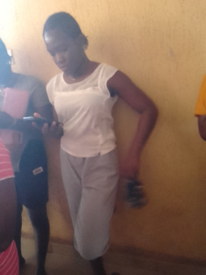A woman in a white top and grey sweatpants stands against a yellow wall. She is dark-skinned and looking down, with her right hand holding a dark object. A person to her left is holding a phone or tablet. The location is Ukwu-Abwa, Nigeria. Other people are partially visible on the sides of the frame.