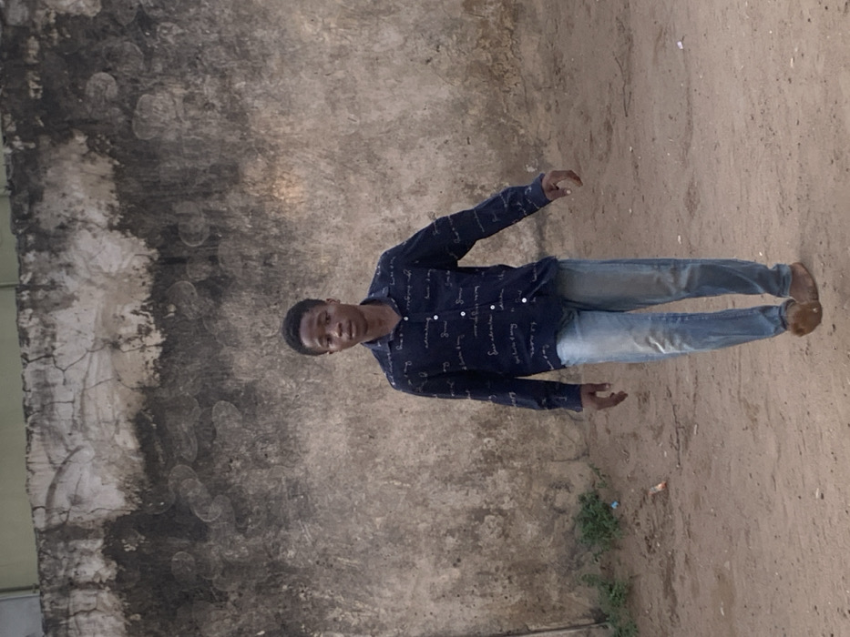 A young man in a dark blue button-down shirt and jeans stands on a dirt and gravel ground. He faces the viewer with a slightly stern expression. The background features a worn, gray wall with patches and discoloration. The lighting is diffused, casting soft shadows. The person's footwear is visible and the surrounding environment appears to be outdoors.
