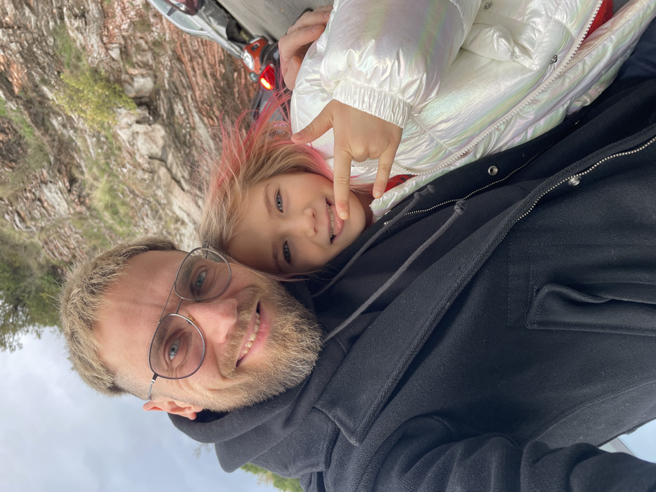 A selfie captures a blond man with a beard and glasses smiling with a young girl, who has dyed pink streaks, nestled close to him