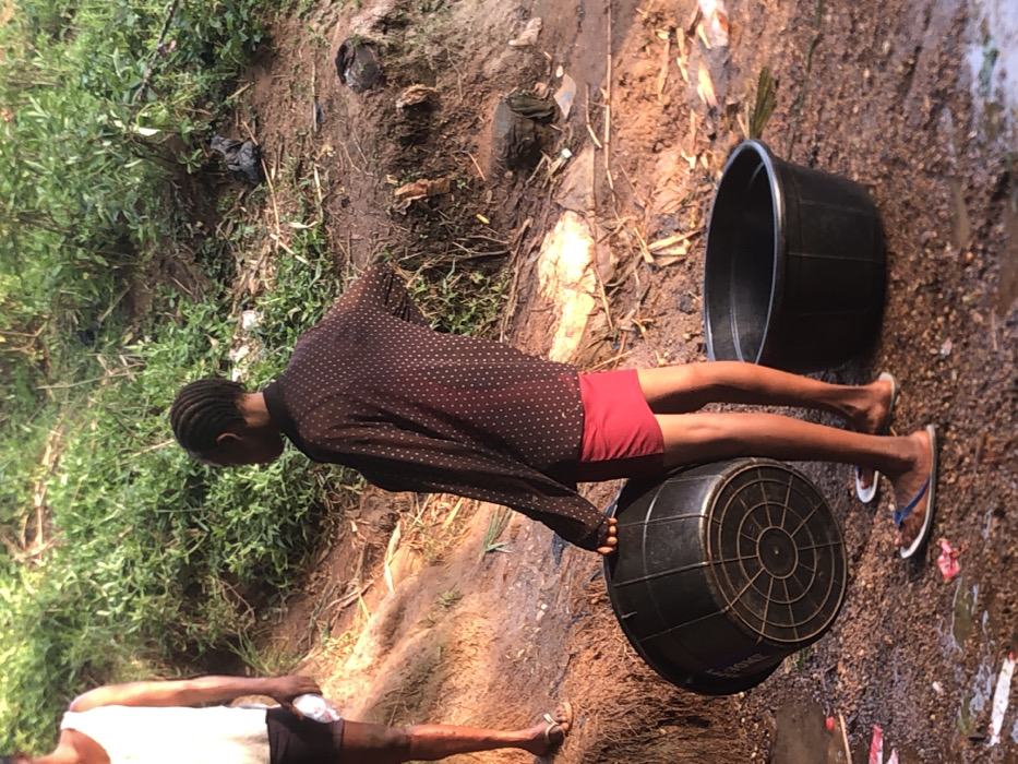 The image depicts an outdoor scene in Ukwu-Abwa, Nigeria, characterized by an uneven, reddish-brown dirt ground with muddy patches and a sloping bank covered in dense green vegetation in the background. In the central foreground, an individual with braided hair, wearing a dark, sheer, polka-dotted long-sleeved shirt, a red skirt, and blue and white flip-flops, holds a large black plastic basin tilted on its side, revealing its ridged bottom. To the left, a second individual's lower torso and legs are visible; they wear a white tank top, dark shorts, and light-colored flip-flops, standing on a slightly raised muddy incline while holding a white object in their right hand. A second, empty black plastic basin rests upright on the wet ground to the right of the central figure. Scattered debris is visible on the ground. The scene is illuminated by warm, natural sunlight.