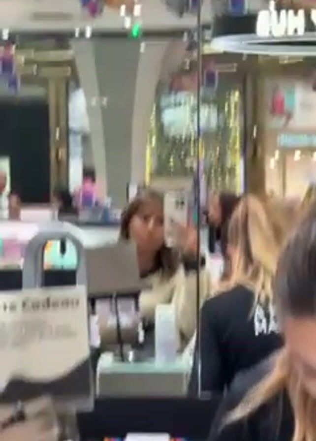interior of a Sephora store. A woman with shoulder-length brown hair is taking a selfie in a mirror. She's wearing a light-colored sweater. Behind her, another woman with auburn hair is also visible. In the foreground, another woman with light brown hair is looking down at something. There are Sephora employees in black shirts visible in the scene. The checkout area is visible with a laptop, cash register and various small items. The store is decorated with holiday-themed decorations hanging from the ceiling. In the background, other stores and shoppers are visible.