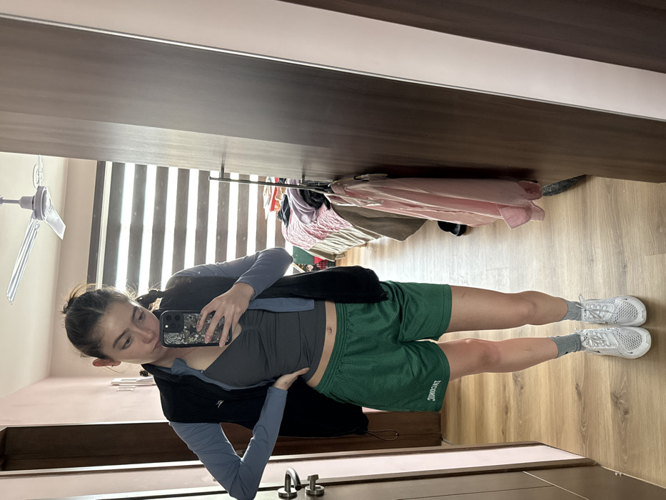 A woman stands facing a mirror. She wears a long-sleeve blue shirt under a dark vest, a cropped grey top, green athletic shorts with white lettering, grey socks, and white athletic shoes. Her hair is pulled back into pigtails. She holds a phone in her left hand, presumably taking the picture. The background shows a room with a ceiling fan, blinds on a window, and clothes hanging. The floor is made of wooden planks, and there is a wooden door visible.