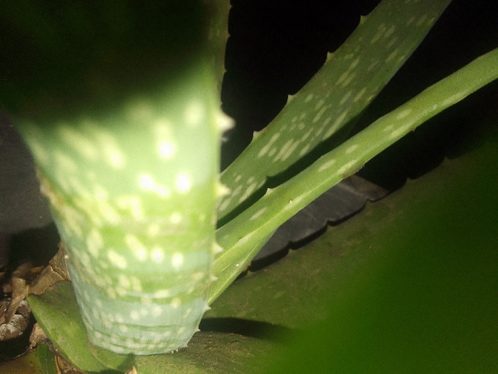 A close-up captures a green aloe plant. The central, thicker stem is adorned with white spots and small thorns. Several thinner leaves, also green with similar white markings, extend outwards. The plant appears to be potted, with glimpses of the container visible in the background, creating a dark backdrop. Overall, the image highlights the plant's unique textures and details.