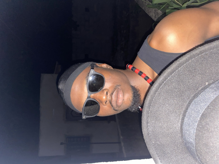 A man wearing a black durag and sunglasses poses at night. He wears a black and red necklace and a black tank top. Part of a dark-colored hat is visible in the foreground. The background shows a building and some foliage.